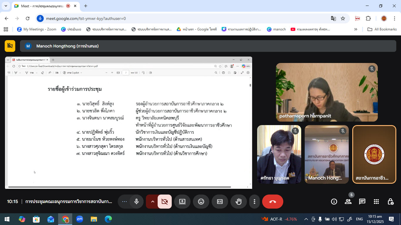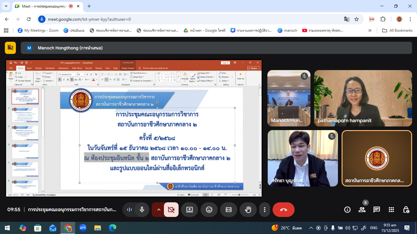 วันจันทร์ที่ 15 ธันวาคม 2568 เวลา 10.00 น. อาชีวศึกษาบัณฑิต สถาบันการอาชีวศึกษาภาคกลาง 2 จัดการประชุมคณะอนุกรรมการวิชาการสถาบันการอาชีวศึกษาภาคกลาง 2 ครั้งที่ 5/2568 เพื่อพิจารณากลั่นกรองข้อมูลด้านวิชาการและพิจารณาเห็นชอบแผนการรับนักศึกษา ปฏิทินการศึกษาปีการศึกษา 2569 โดยมีนางสาวปถมาภรณ์ หาญพานิช ผู้อำนวยการงานทรัพยากรบุคคลกลุ่มบริษัทสยามยนต์ผู้แทนจำหน่ายคูโบต้าประจำจังหวัดลพบุรี-สระบุรี ประธานอนุกรรมการวิชาการดำเนินการประชุมฯ ผ่านระบบออนไลน์และออนไซต์ ณ ห้องประชุมอินทนิล สถาบันการอาชีวศึกษาภาคกลา 2